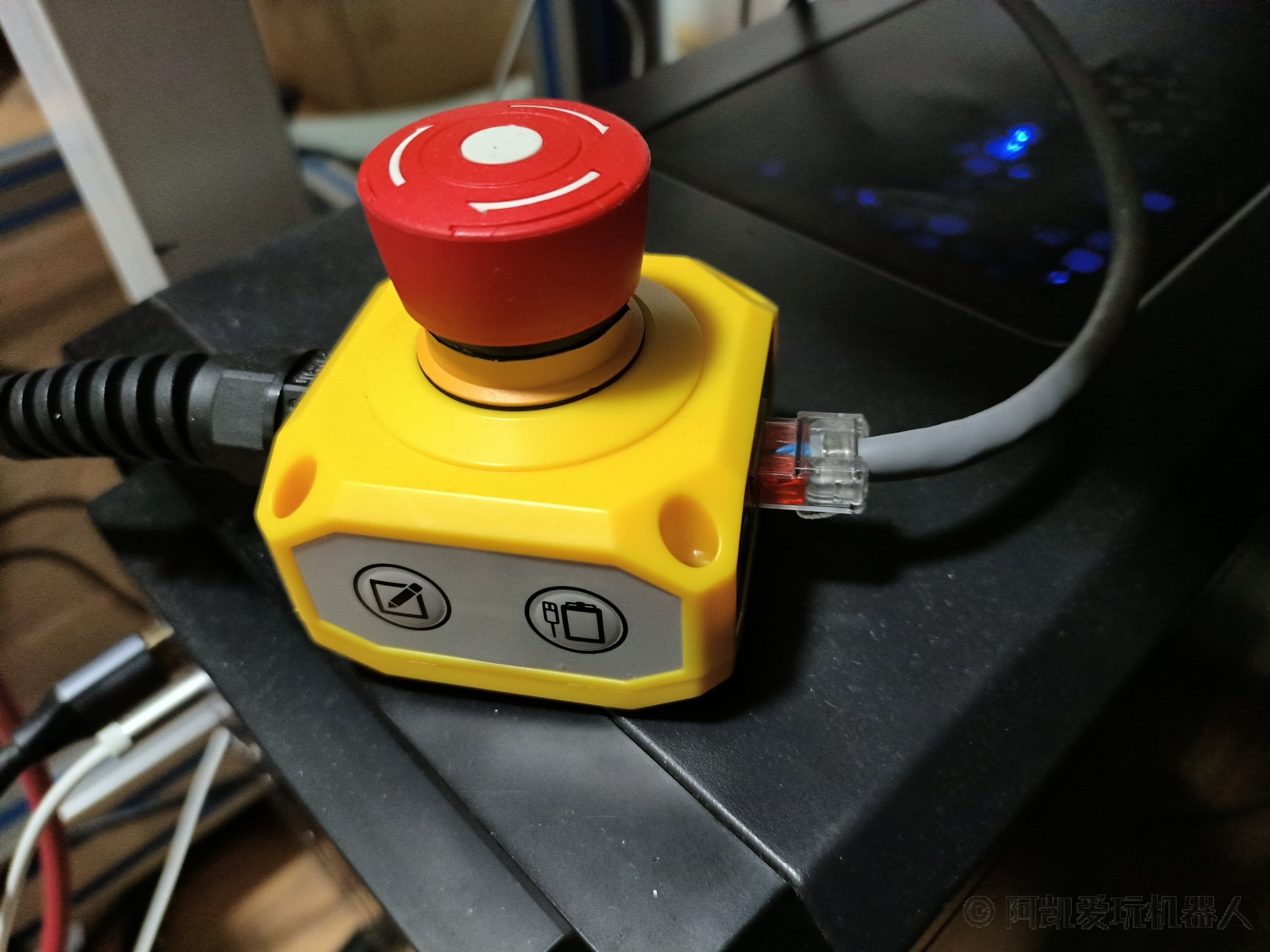 机械臂对外的网口在机械臂急停开关(按钮盒)上。 网线一头接急停开关,另外一头接电脑的有线网卡的网口。