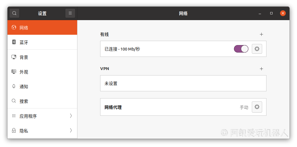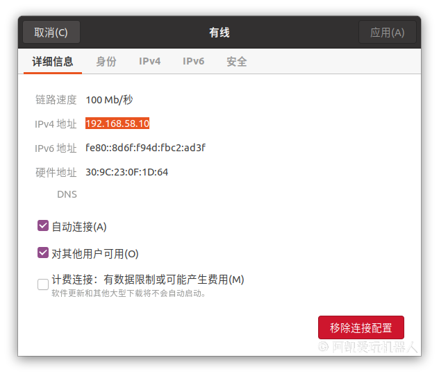 需要注意的是, 此时你之前的有线连接还是连通状态, 配置是改了但是并没有生效。 将有线连接按钮断开然后重新连接, 此时配置生效。