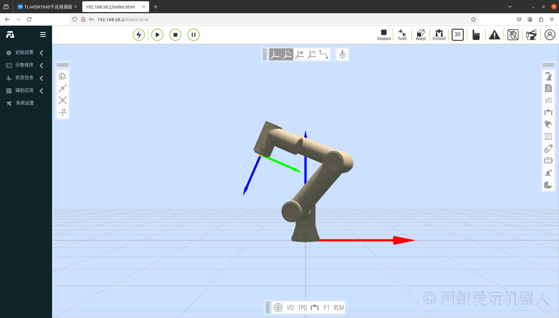 按钮。 就可以看到机械臂Web管理界面,可以预览机械臂3D模型以及遥控机械臂。