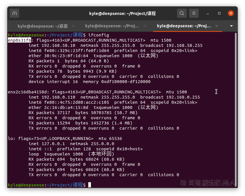 命令行, 查看有线网卡的名称, 例如: