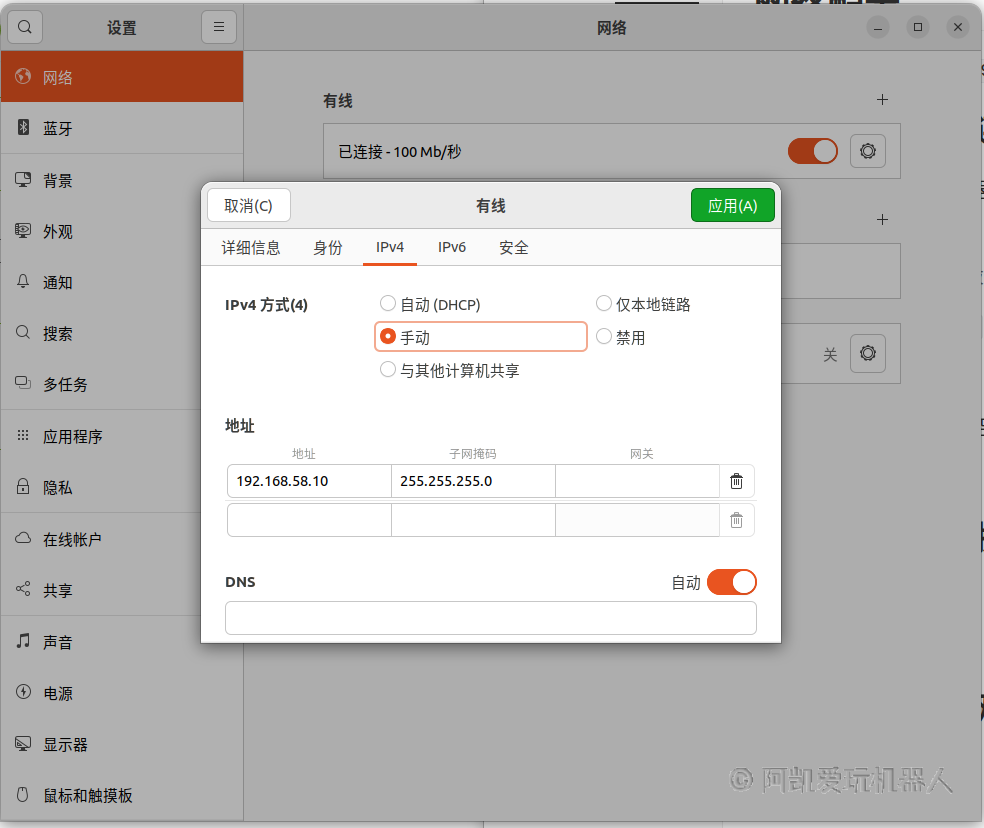 打开有线连接的IPv4方式配置, 选择到 手动 。 然后做如下配置: