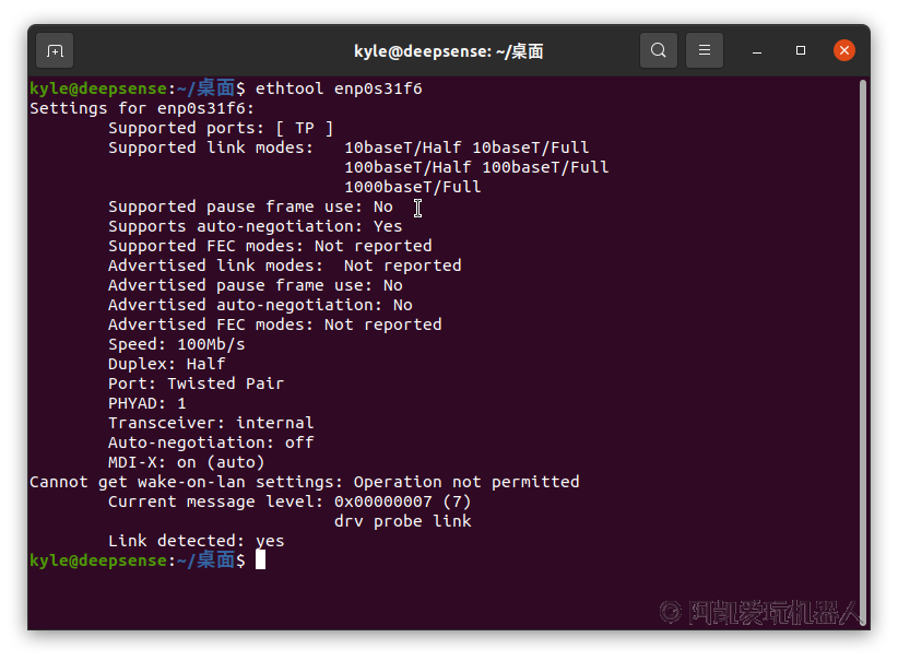 # 网卡enp0s31f6的配置项: Settings for enp0s31f6: Supported ports: [ TP ] # 支持的通信速度与半双工/全双工模式 Supported link modes: 10baseT/Half 10baseT/Full 100baseT/Half 100baseT/Full 1000baseT/Full Supported pause frame use: No # 支持通信速率协商: 是 Supports auto-negotiation: Yes Supported FEC modes: Not reported # 建议的工作模式: Advertised link modes: 10baseT/Half 10baseT/Full 100baseT/Half 100baseT/Full 1000baseT/Full Advertised pause frame use: No Advertised auto-negotiation: Yes Advertised FEC modes: Not reported # 网卡当前的工作模式: # - 速度为 100 Mb/s Speed: 100Mb/s # - 全双工 Duplex: Full # - 端口(传输介质): 双绞线 Port: Twisted Pair PHYAD: 1 Transceiver: internal # 自动沟通传输速率: 开 # 注: 两个网络设备相互协商,找到双方都支持的最大传输速率 Auto-negotiation: on MDI-X: on (auto) Supports Wake-on: pumbg Wake-on: g Current message level: 0x00000007 (7) drv probe link Link detected: yes