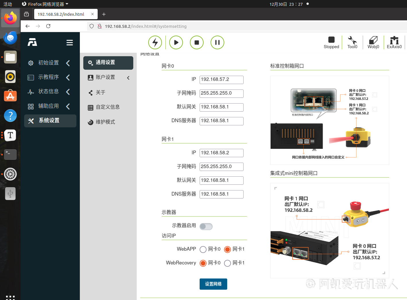 我们也可以通过配置界面, 把Web APP的网口改为网卡0, 网线一端接机械臂运动控制器, 另外一端接电脑。